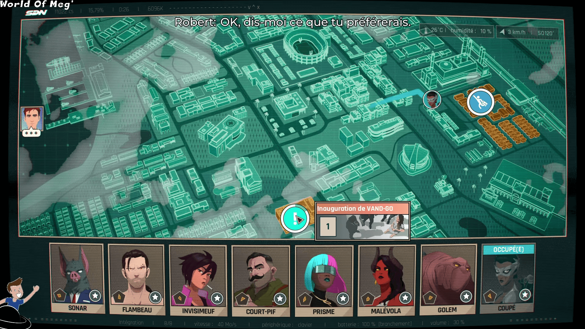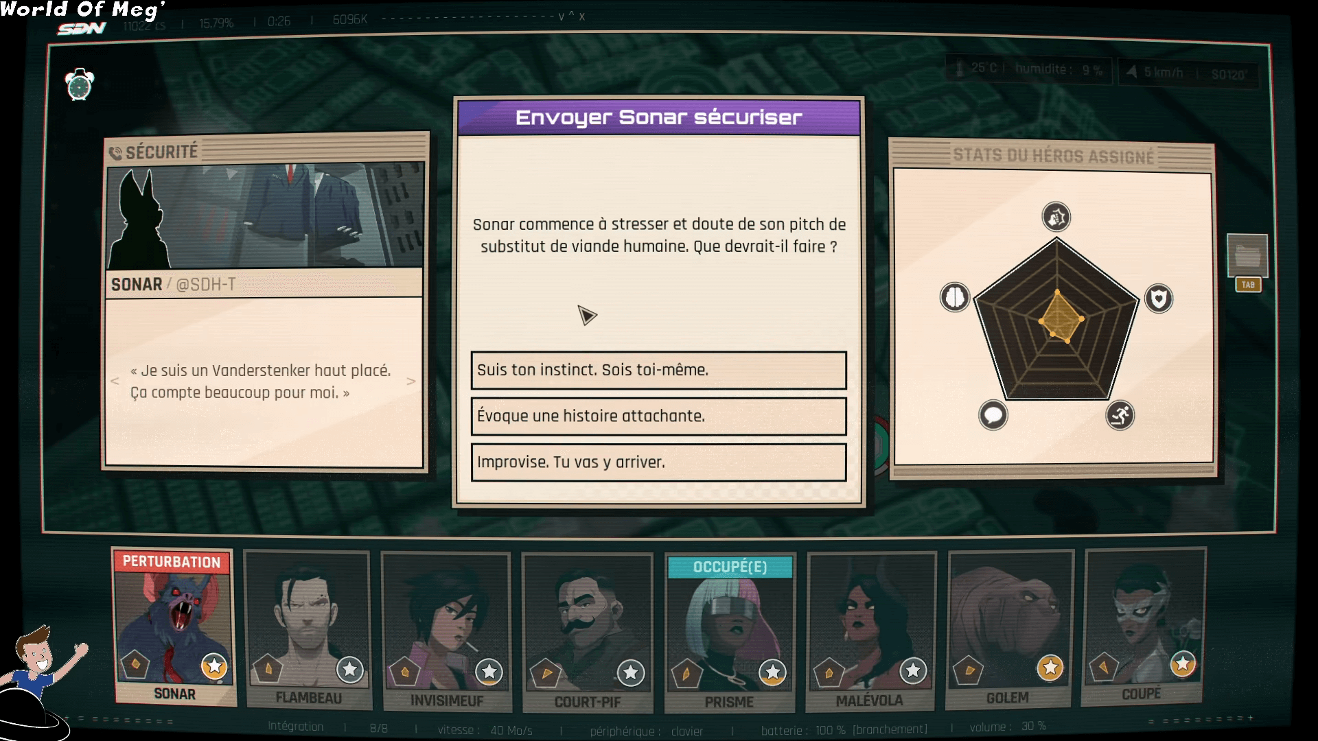 On est face à son écran, on voit des alertes apparaître et on doit désigner quel(s) membre(s) de notre équipe envoyer en analysant la description de la situation et les capacités de nos personnages. Ils possèdent tous un score allant de 0 à 10 dans 5 caractéristiques (vigueur, combat, mobilité, intellect et charisme) qui permettent de répondre à tel ou tel problème. On peut également en résoudre grâce aux capacités uniques de certains membres de notre équipe ou à leur personnalité, il y a parfois vraiment un héros idéal à envoyer pour une mission.
