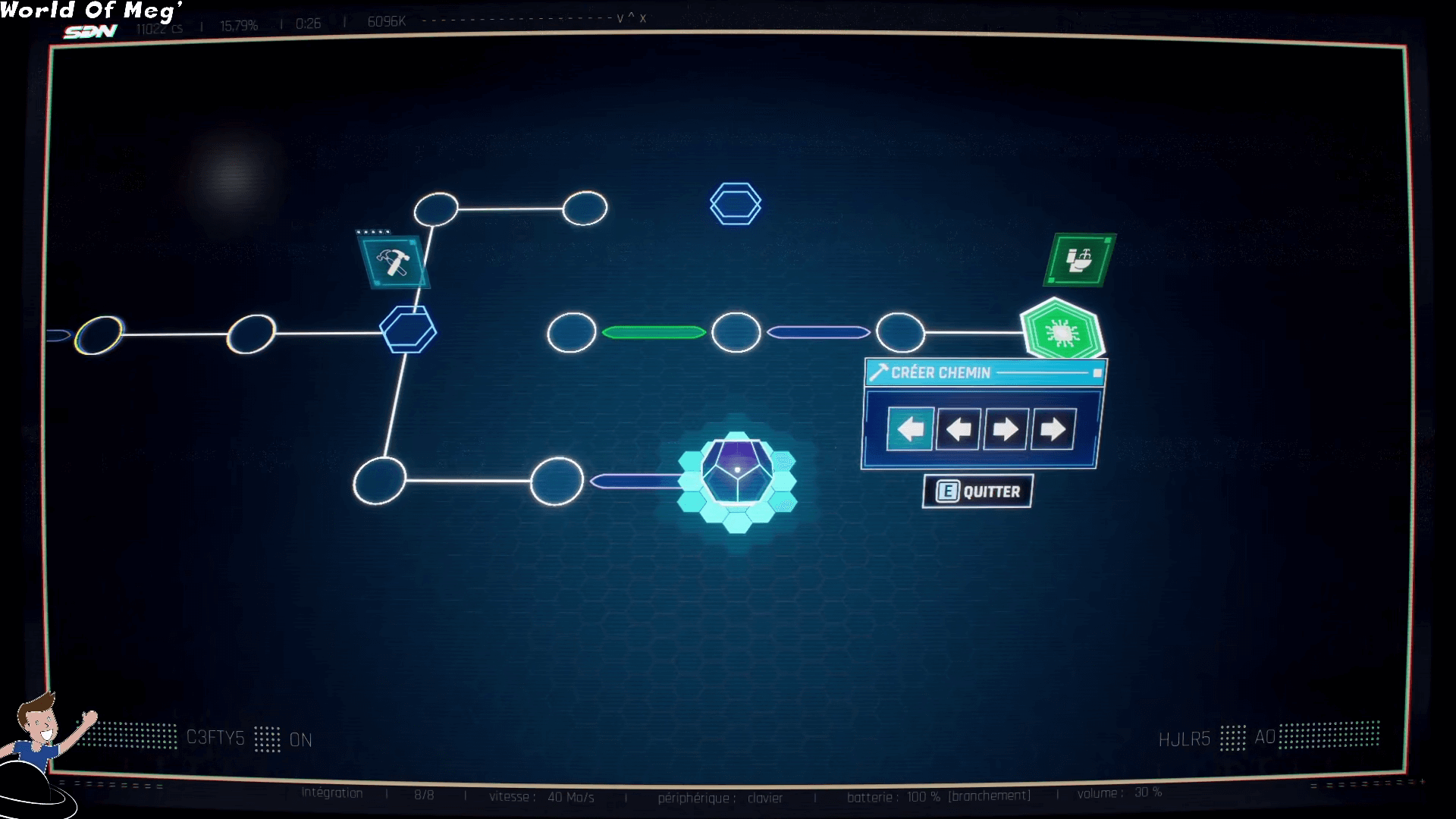 Dans ces parties là, il y a également des moments où nous pouvons être plus actifs. Certaines missions vous nous demander de faire du hacking qui dans le jeu consiste, je vous mets une capture d’écran pour mieux illustrer, à déplacer une petite boule via divers chemins jusqu’à une destination en ayant divers obstacles qui vont soit nous demander de répéter des séquences directionnelles ou éviter des protections. Une autre manière d’impliquer le joueur qui fonctionne pas mal de mon point de vue.