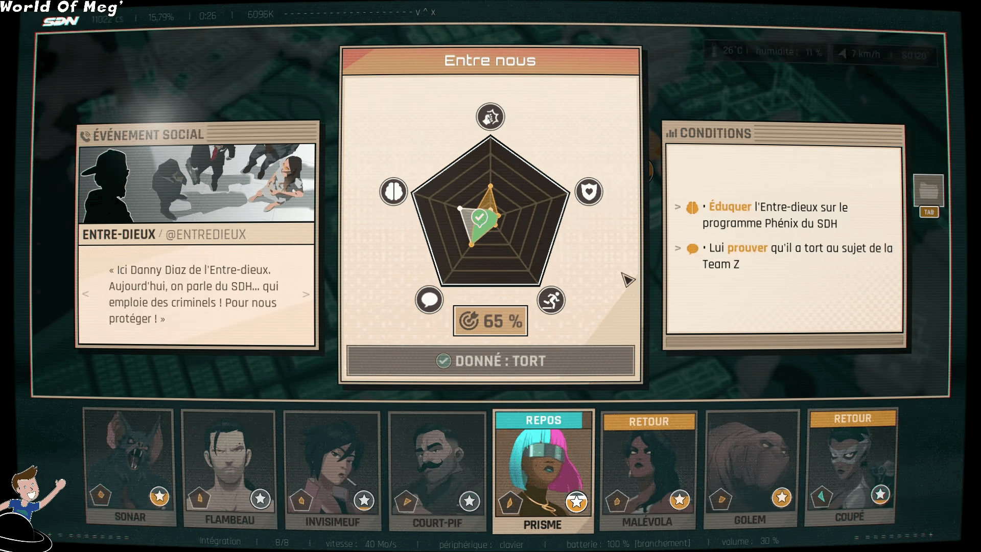Vous pouvez le voir dans mon playthrough sur Youtube, mais de mon côté, j’ai assez épaulé Invisimeuf que pour qu’elle fasse le bon choix et reste du bon côté à la fin, j’ai choisi le côté romantique avec Aurore, j’avais retiré Coupé de l’équipe et je l’ai réintégrée à la fin du jeu … mais allez voir le reste et vous verrez mes décisions, bonnes et mauvaises.