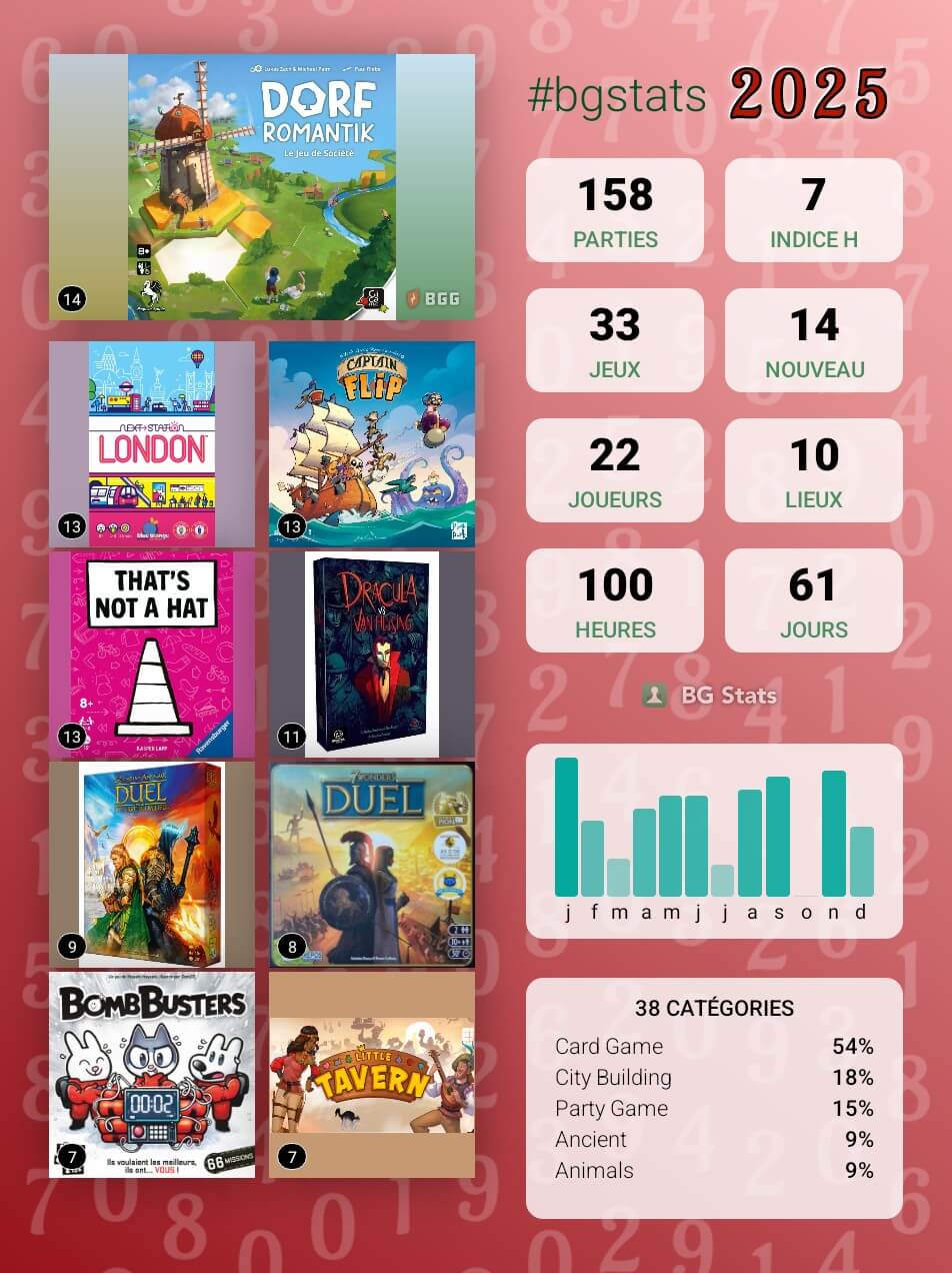 158 parties jouées en 2025, on est dans des valeurs similaires à celles de l’an dernier, idem pour les 69 parties en duo.