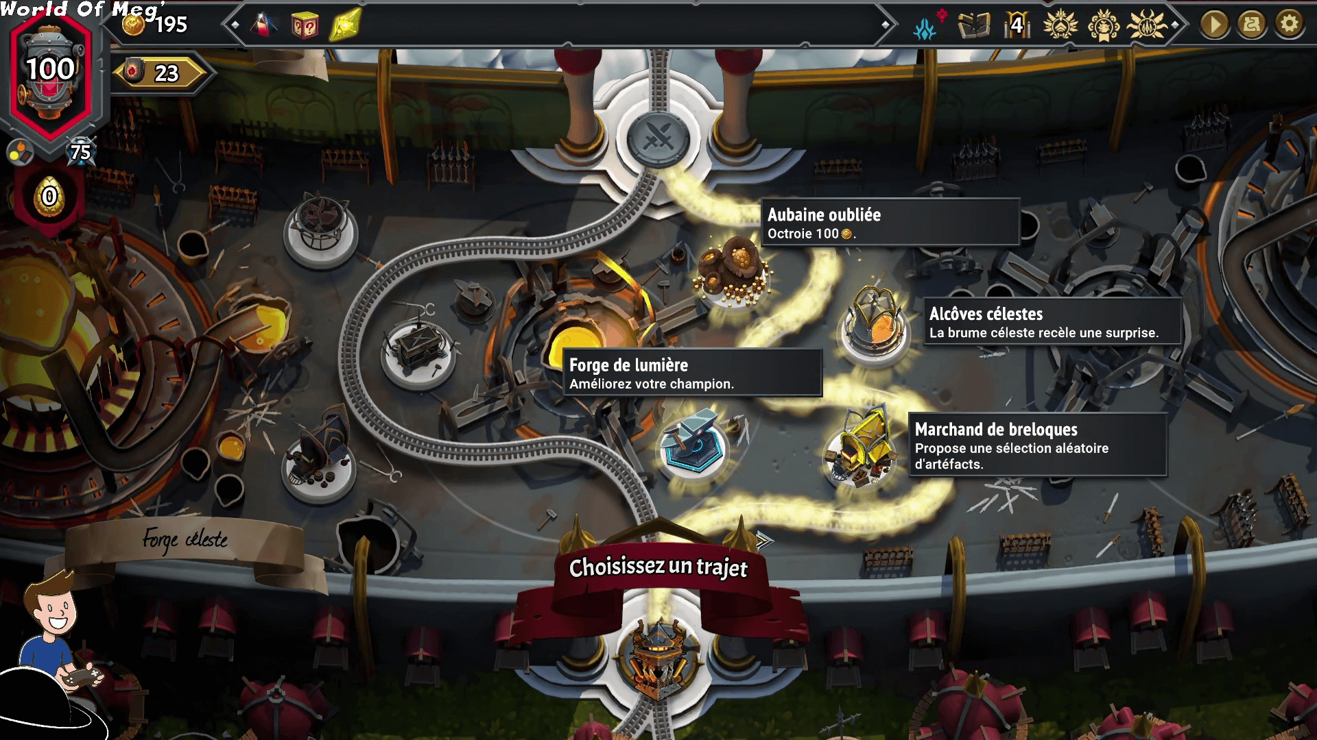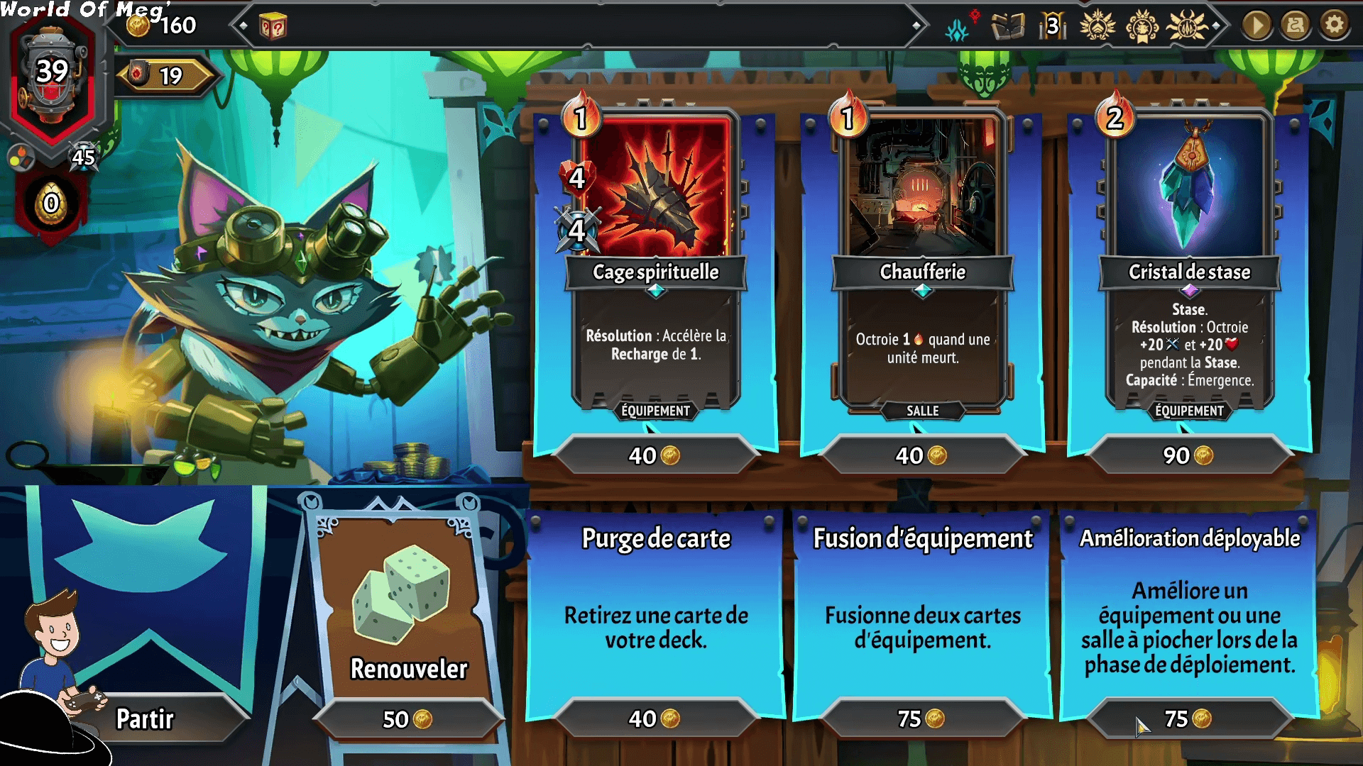 Entre chaque niveau, on va avoir diverses opportunités d’améliorer notre deck, d’acheter de nouvelles cartes, d’avoir des événements aléatoires ou encore de soigner votre cœur de brasier.