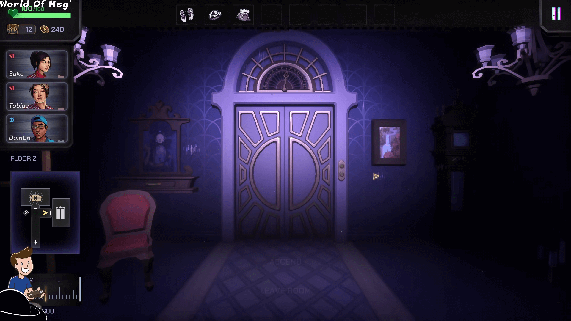 On visite chaque étage un peu comme un Dungeon Crawler en pouvant aller vers l’avant, l’arrière et pivoter vers la droite et la gauche. On a parfois des combats aléatoires dans les couloirs mais c’est surtout en ouvrant les différentes portes qu’on déclenche un événement aléatoire ou un combat ou qu’on découvre l’ascenseur qui nous amènera à l’étage suivant.