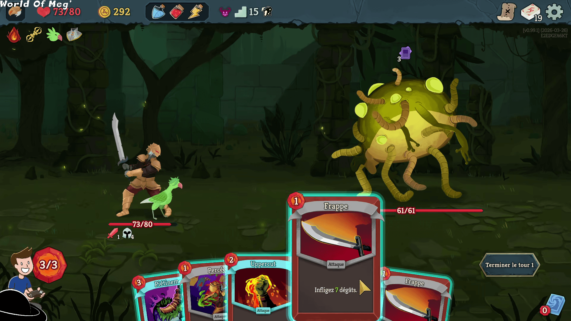 De notre côté, chaque tour on pioche un certain nombre de cartes qui vont nous permettre soit d’infliger des dégâts, soit de se défendre contre une certaine quantité d’attaque ou encore de mettre des effets positifs ou négatifs qui nous aideront pour la suite du combat. Une fois nos actions réalisées, les ennemis font leurs réactions prévues et puis on passe au tour suivant, jusqu’à ce qu’ils soient battus, ou qu’ils nous aient mis à terre.